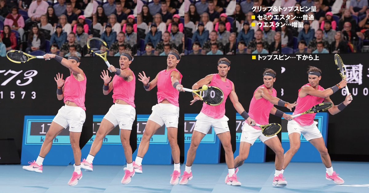 主にセミウエスタングリップのフォアハンドはトップスピンを生み、ウエスタングリップのフォアハンドはさらに回転量の多いトップスピンを生み出します。それはとても高く弾みます。
