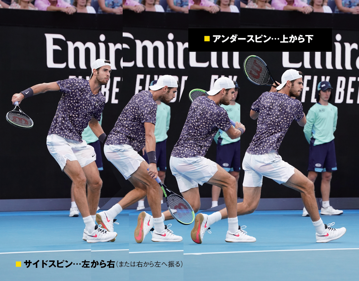 イメージしてみましょう。低い位置から高い位置へのスイングは通常トップスピンを生み、その逆の高い位置から低い位置へのスイングは、アンダースピンを生みます。ラケット面を後方で上向きにすることでスライスになります。