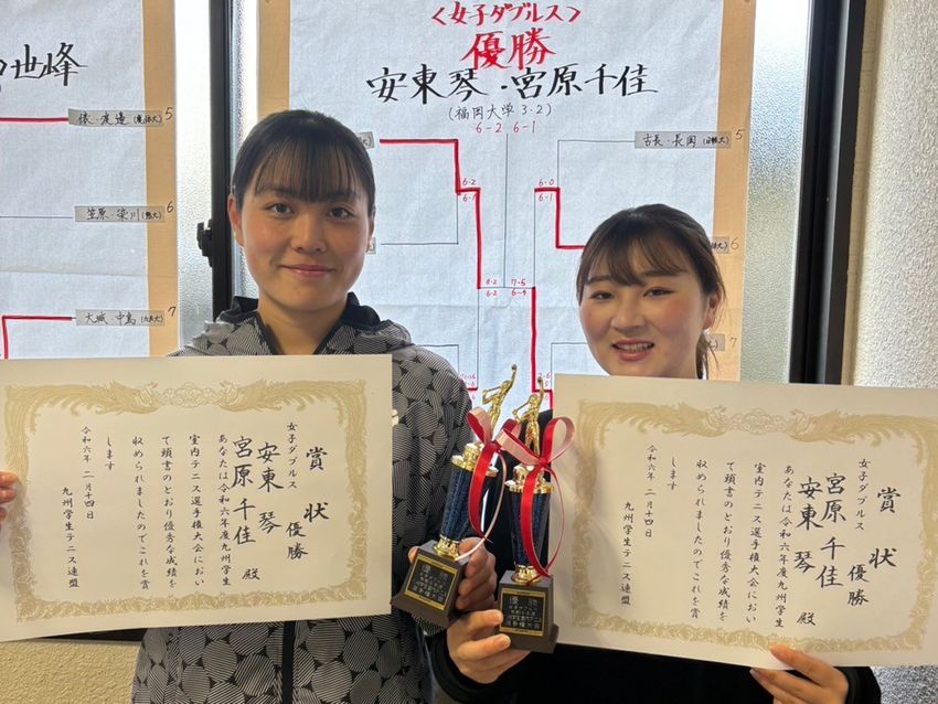 女子ダブルス優勝の安東琴(左)/宮原千佳(福岡大学3年/2年)(写真提供◎九州学生テニス連盟)