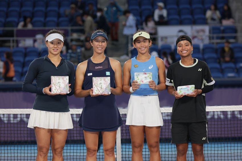 左から女子ダブルス優勝のグオ・ハンユー(中国)、柴原瑛菜(橋本総業ホールディングス)、準優勝のランラーナ・タラルディー(タイ)、マナンチャヤ・サワンカエウ(タイ)(写真提供◎安藤証券オープン東京2025、撮影◎JET田中)
