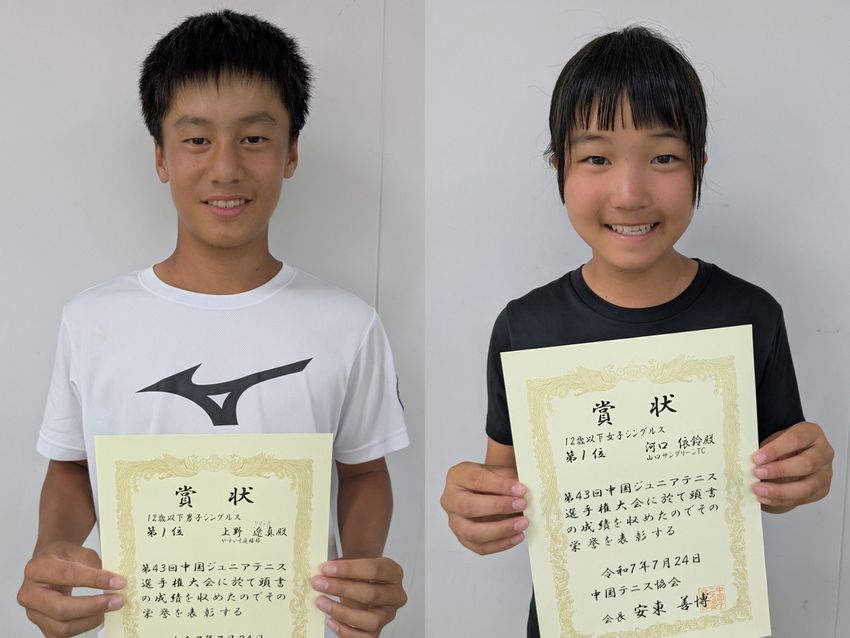 12歳以下シングルスは上野遼真(広島/やすいそ庭球部)と河口依鈴(山口/山口サングリーンTC)が優勝、上野は単複2冠 [2025中国ジュニア]