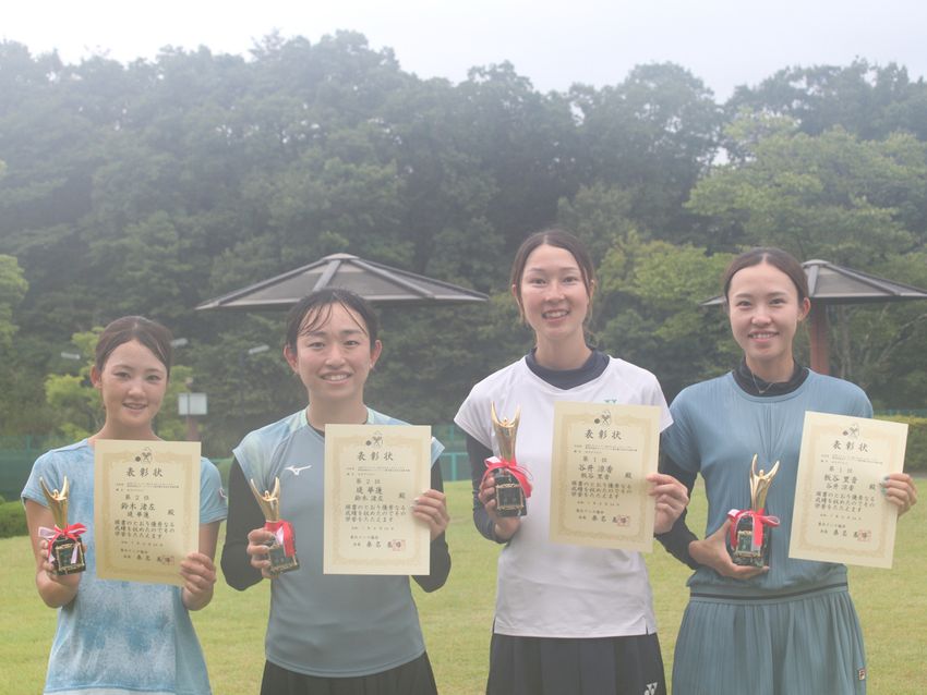 (右から)女子ダブルス優勝の板谷里音(リコー)、谷井涼香(リコー)、準優勝の堤華蓮(島津製作所)、鈴木渚左(島津製作所)(写真提供◎宮城県テニス協会)