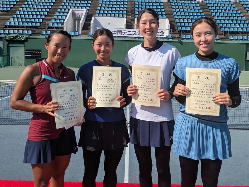 左から女子ダブルス優勝の古屋美智留(大磯テニスアカデミー)、石井あづさ(TEAM EARNEST KOBE)、準優勝の谷井涼香(リコー)、板谷里音(リコー)(写真提供◎中国テニス協会)