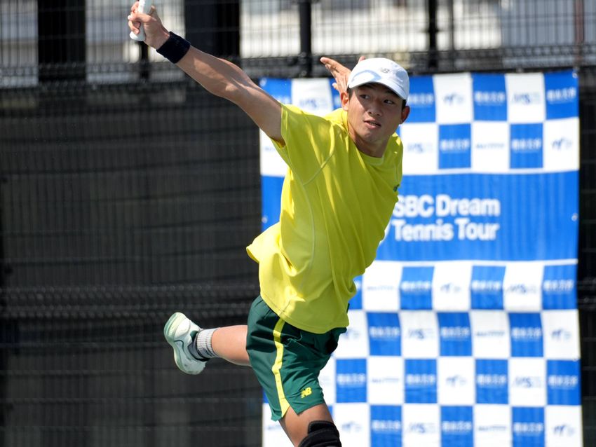 写真は男子シングルス2回戦に進出した山中太陽(EMシステムズ)(©SBC Dream Tennis Tour 事務局)