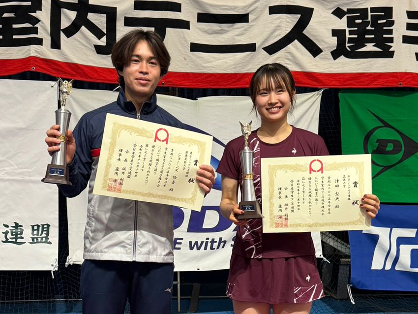ジョーンズ怜音(慶應義塾大2年)が男子シングルスで学生大会初優勝、インカレ女王の津田梨央(筑波大1年)は単複2冠 [2025インカレ室内]