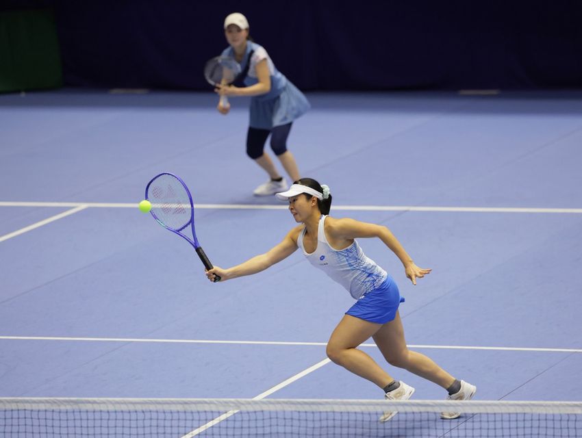 女子ダブルス準決勝に進出した木下晴結(奥)/齋藤咲良(ミキハウス/富士薬品)(写真提供◎京都府テニス協会、撮影◎眞野博正)