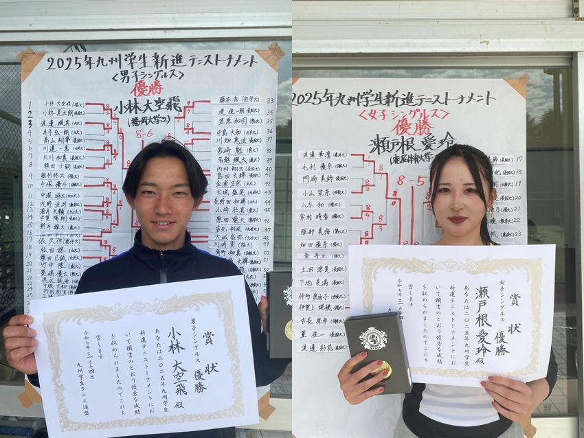 シングルスで優勝を飾った小林大空飛(福岡大学2年/左)と瀬戸根愛玲(鹿屋体育大学2年)(写真提供◎九州学生テニス連盟)