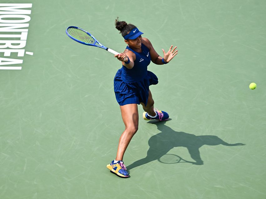 MONTREAL, CANADA - JULY 30: Naomi Osaka of Japan plays a forehand against Liudmila Samsonova during their second round match on Day Four of the WTA 1000 National Bank Open at IGA Stadium on July 30, 2025 in Montreal, Quebec, Canada. (Photo by Minas Panagiotakis/Getty Images)