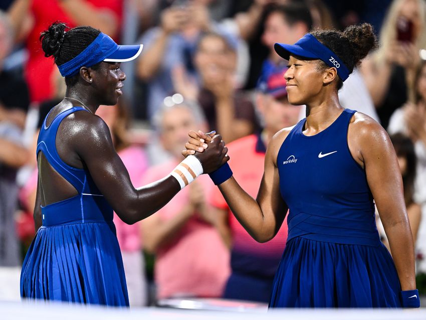 MONTREAL, CANADA - AUGUST 07: Naomi Osaka (R) of Japan congratulates Victoria Mboko of Canada following her victory during the Women's Singles Final match on day twelve of the WTA 1000 National Bank Open at IGA Stadium on August 7, 2025 in Montreal, Quebec, Canada. (Photo by Minas Panagiotakis/Getty Images)