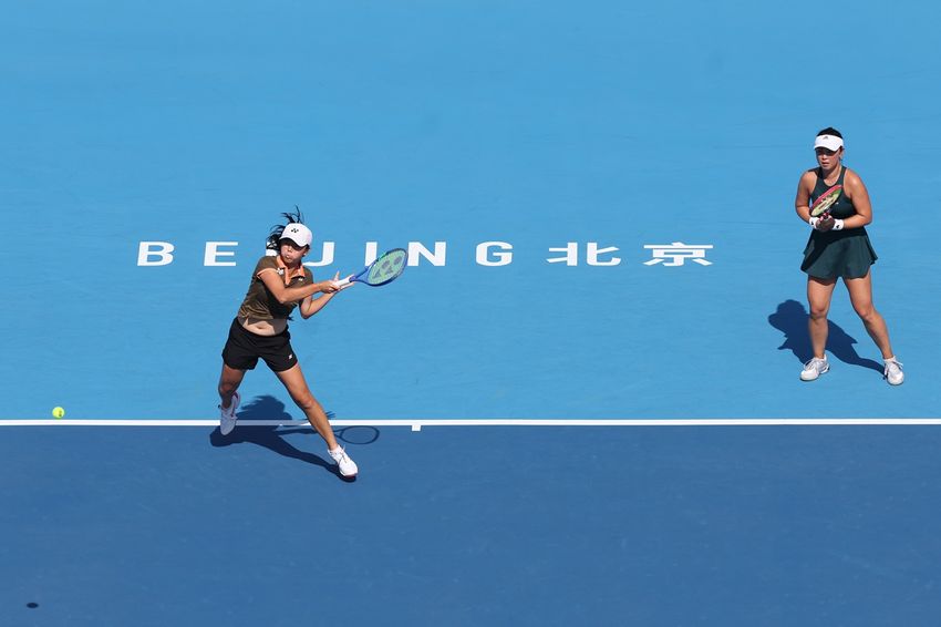 BEIJING, CHINA - SEPTEMBER 28: Eri Hozumi of Japan and Fang-Hsien Wu of Chinese Taipei return a shot against Maya Joint of Australia and Caty McNally of the United States in the Women's Doubles First Round on day 7 of 2025 China Open at National Tennis Center on September 28, 2025 in Beijing, China. (Photo by Emmanuel Wong/Getty Images)