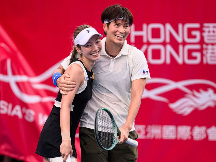 HONG KONG, CHINA - OCTOBER 31: Momoko Kobori of Japan and Peangtarn Plipuech of Thailand celebrates after winning their match against Kamilla Rakhimova and Aliaksandra Sasnovich during the women's doubles semi-finals matches on day five of the Prudential Hong Kong Tennis Open at Victoria Park on October 31, 2025 in Hong Kong, China. (Photo by Marcio Machado/Getty Images)