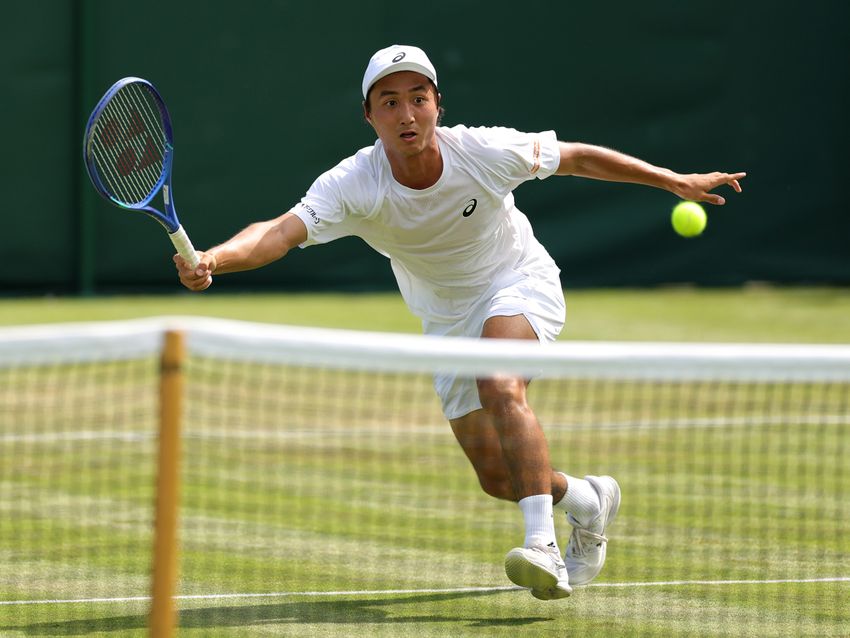 LONDON, ENGLAND - JULY 01: Shintaro Mochizuki of Japan plays a forehand against Giulio Zeppieri of Italy during the Gentlemen's Singles first round match on day two of The Championships Wimbledon 2025 at All England Lawn Tennis and Croquet Club on July 01, 2025 in London, England. (Photo by Ezra Shaw/Getty Images)