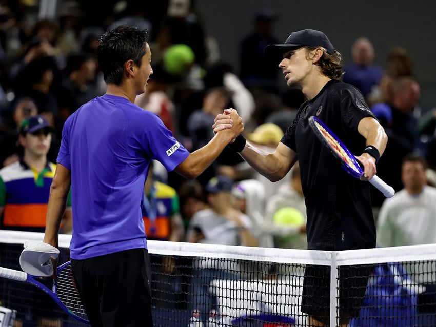 NEW YORK, NEW YORK - AUGUST 28: (L-R) Shintaro Mochizuki of Japan embraces Alex de Minaur of Australia after their Men's Singles Second Round match on Day Five of the 2025 US Open at USTA Billie Jean King National Tennis Center on August 28, 2025 in the Flushing neighborhood of the Queens borough of New York City. (Photo by Matthew Stockman/Getty Images)