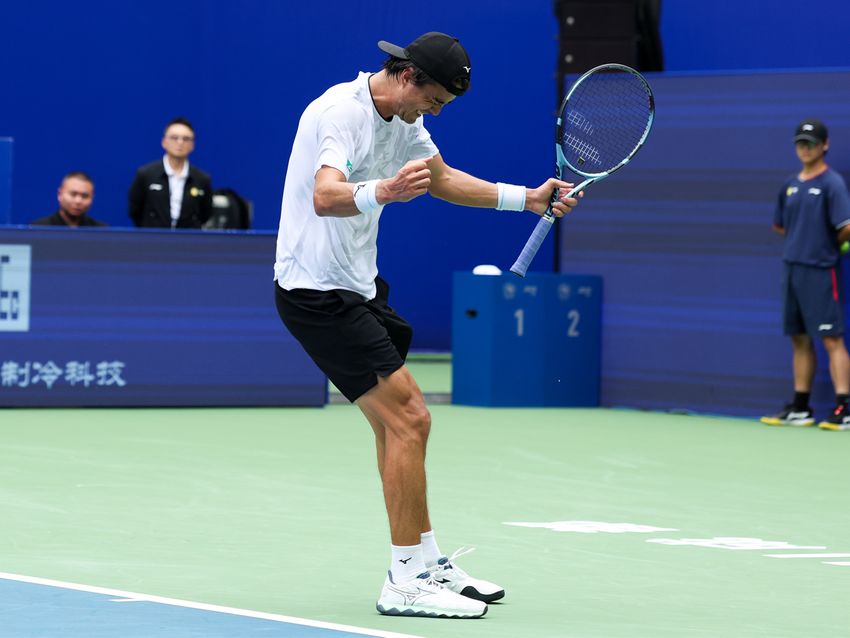 CHENGDU, CHINA - SEPTEMBER 20: Taro Daniel of Japan celebrates the victory after match against Tallon Griekspoor of Netherlands during the men's singles second round match in the 2025 ATP Chengdu Open at Sichuan International Tennis Center on September 20, 2025 in Chengdu, China. (Photo by Zhizhao Wu/Getty Images)