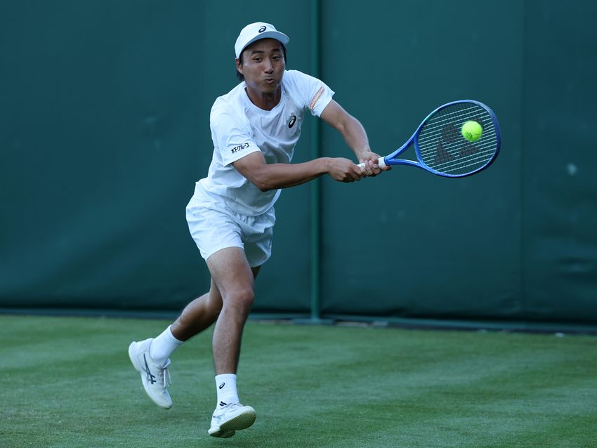 LONDON, ENGLAND - JUNE 30: Shintaro Mochizuki of Japan plays a backhand against Giulio Zeppieri of Italy during the Gentlemen's Singles first round match on day one of The Championships Wimbledon 2025 at All England Lawn Tennis and Croquet Club on June 30, 2025 in London, England. (Photo by Clive Brunskill/Getty Images)
