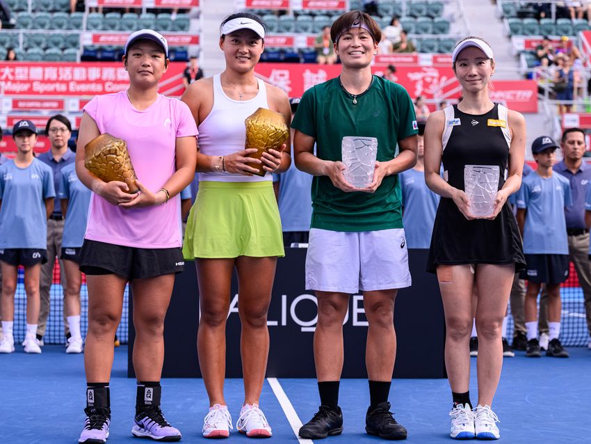 HONG KONG, CHINA - NOVEMBER 2: (L-R) Xinyu Jiang and Yafan Wang of China celebrates with the winners trophy after winning their match against Peangtarn Plipuech of Thailand and Momoko Kobori of Japan during the women's doubles final match on day seven of the Prudential Hong Kong Tennis Open at Victoria Park on November 2, 2025 in Hong Kong, China. (Photo by Marcio Machado/Getty Images)