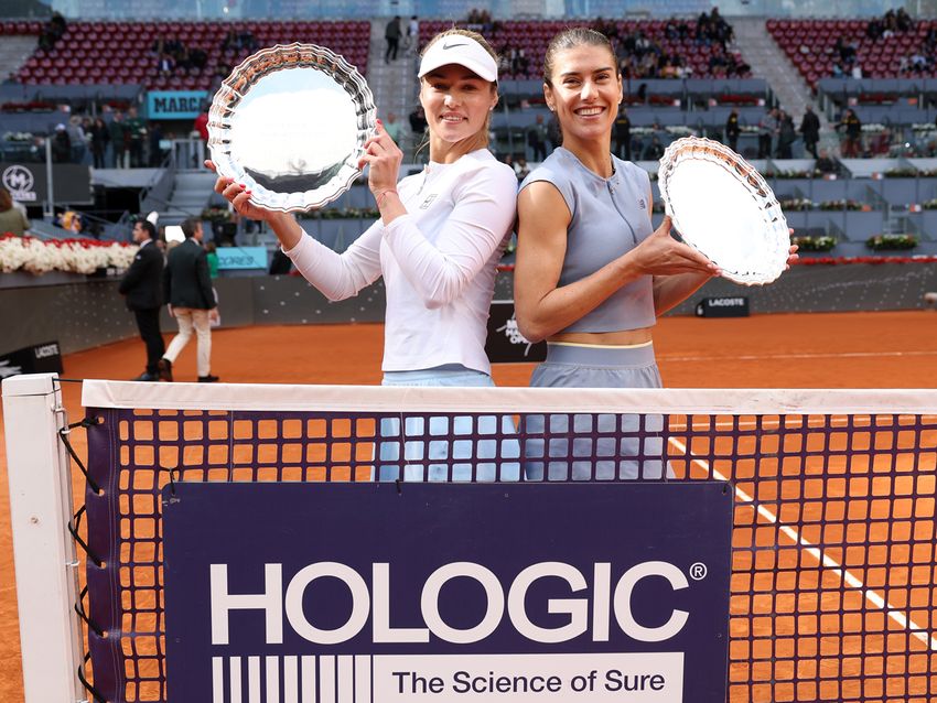 MADRID, SPAIN - MAY 04: Anna Kalinskaya and her partner Sorana Cirstea of Romania pose for a photo with their trophies after winning the Women's Doubles Final against Elise Mertens of Belgium and Veronika Kudermetova on Day Thirteen of the Mutua Madrid Open at La Caja Magica on May 04, 2025 in Madrid, Spain. (Photo by Clive Brunskill/Getty Images)