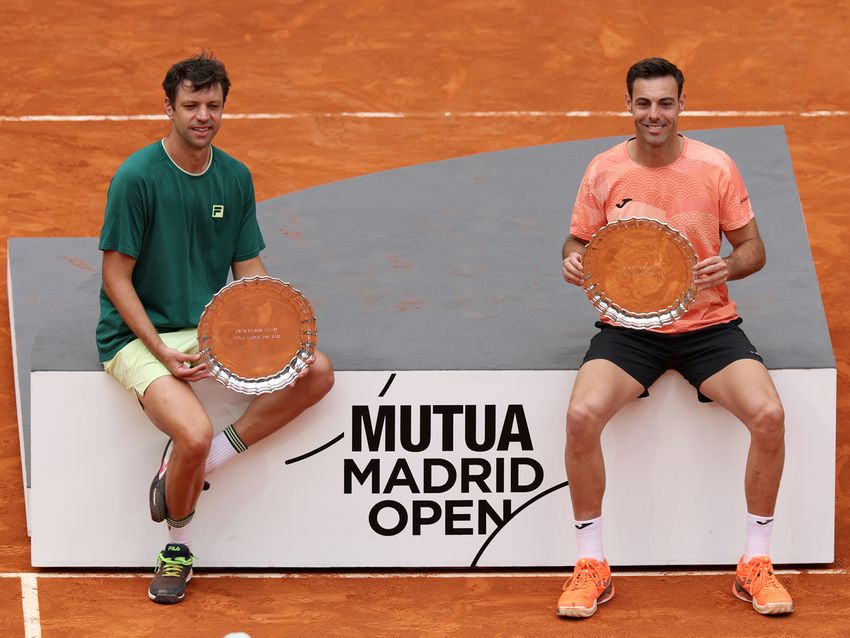 MADRID, SPAIN - MAY 03: Horacio Zeballos of Argentina and Marcel Granollers of Spain pose for a photo with their Mutua Madrid Open Men's Doubles Final trophies following their victory against Marcelo Arevalo of Salvador and Mate Pavic of Croatia on Day 12 of the Mutua Madrid Open at La Caja Magica on May 03, 2025 in Madrid, Spain. (Photo by Clive Brunskill/Getty Images)