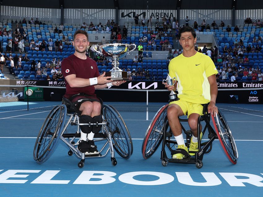 MELBOURNE, AUSTRALIA - JANUARY 25: Winner Alfie Hewett (L) of Great Britain and runner-up Tokito Oda (R) of Japan pose after the Men's Wheelchair Singles Final during day 14 of the 2025 Australian Open at Melbourne Park on January 25, 2025 in Melbourne, Australia. (Photo by Graham Denholm/Getty Images)