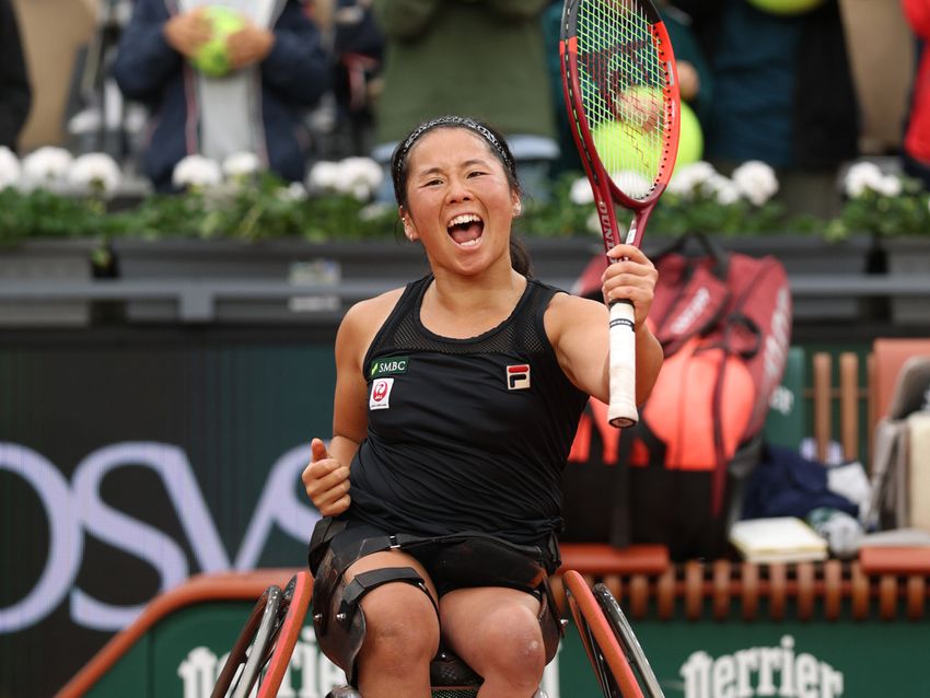 PARIS, FRANCE - JUNE 07: Yui Kamiji of Japan celebrates her victory over Aniek Van Koot of the Netherlands in the Women’s Wheelchair Singles final during Day Fourteen of the 2025 French Open at Roland Garros on June 07, 2025 in Paris, France. (Photo by Adam Pretty/Getty Images)