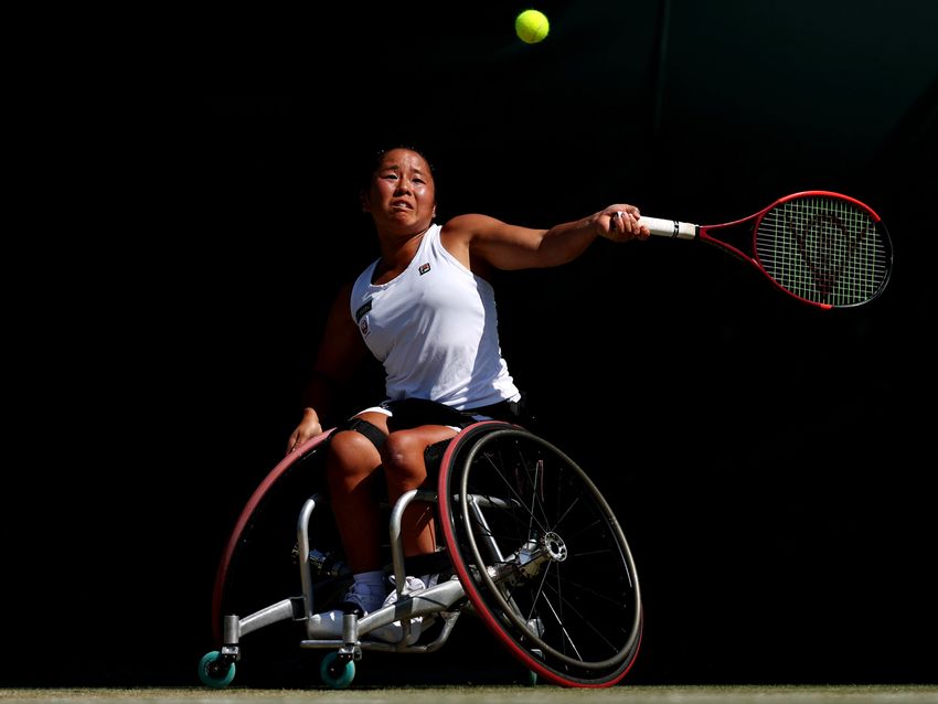 LONDON, ENGLAND - JULY 08: Yui Kamiji of Japan plays a forehand against Angelica Bernal of Colombia during the Ladies' Wheelchair Singles First Round match on day nine of The Championships Wimbledon 2025 at All England Lawn Tennis and Croquet Club on July 08, 2025 in London, England. (Photo by Julian Finney/Getty Images)