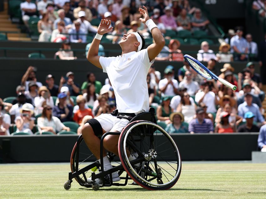 LONDON, ENGLAND - JULY 13: Tokito Oda of Japan celebrates winning Championship point against Alfie Hewett of Great Britain during the Gentlemen’s Wheelchair Singles Final on day fourteen of The Championships Wimbledon 2025 at All England Lawn Tennis and Croquet Club on July 13, 2025 in London, England. (Photo by Dan Istitene/Getty Images)
