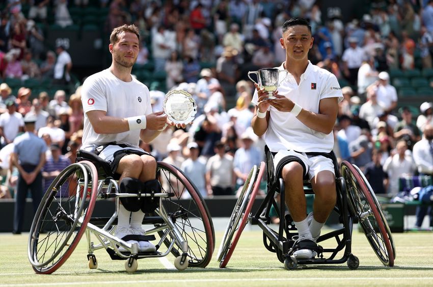 LONDON, ENGLAND - JULY 13: Alfie Hewett of Great Britain poses with the Gentlemen’s Wheelchair Singles Runner-Up Trophy alongside Tokito Oda of Japan with the Gentlemen’s Wheelchair Singles Trophy following the Gentlemen’s Wheelchair Singles Final on day fourteen of The Championships Wimbledon 2025 at All England Lawn Tennis and Croquet Club on July 13, 2025 in London, England. (Photo by Dan Istitene/Getty Images)