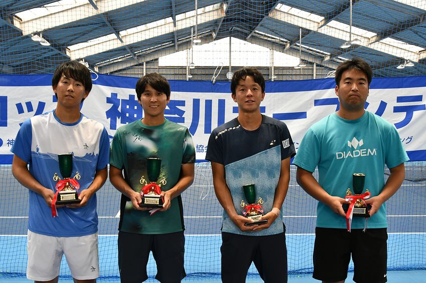 左から男子ダブルス優勝の尾島萌杜(テニス ハウス fun)、髙田航輝(パームインターナショナルテニスアカデミー)、準優勝の竹島駿朗(JITC)、小見山僚(ノアインドアステージ)(写真提供◎神奈川県テニス協会)