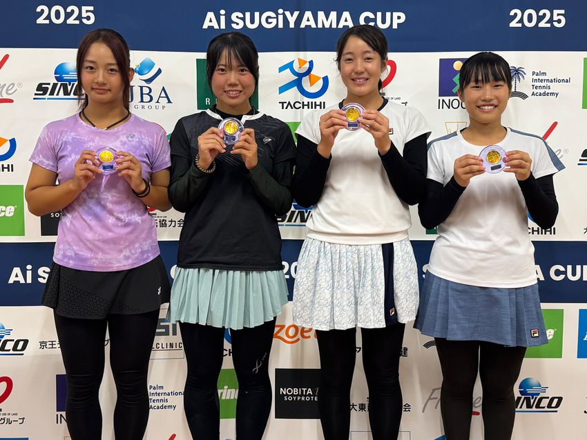 左から女子ダブルス優勝の大滝莉央(アクロステニスアカデミー)、坂下紗彩(浪速学院)、準優勝の奥谷友結(O's)、高山知咲希(ユニークスタイルTA)(写真提供◎パーム・インターナショナル・テニス・アカデミー)