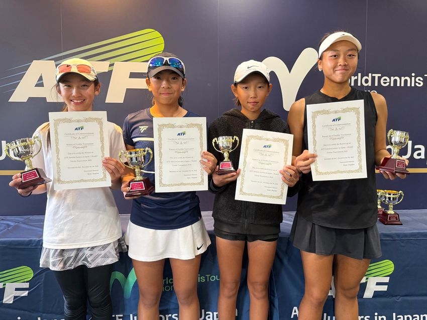 左から女子ダブルス優勝の中川苺(自由が丘インターナショナルテニスカレッジ)、安達来紀(B6TC)、準優勝のイ・ジョン(韓国)、キム・セボン(韓国)(写真提供◎SPORTS SUNRISE .COM)