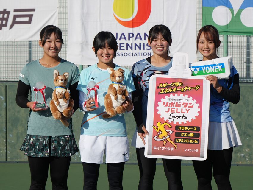 左から女子ダブルス優勝の鈴木美波(Wishテニスクラブ)、塩見渚(T.K.C Jrアカデミー)、準優勝の西川桃絆(トップランAIOI)、大滝莉央(アクロステニスアカデミー)(©ヨネックス)