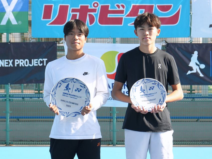 男子シングルスで優勝を飾った藤原友紀(みんなのテニス/左)と準優勝の天野雄太(ITM TEAM)(©ヨネックス)