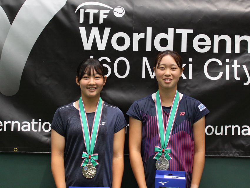 女子シングルスで優勝を飾った鈴木美波(Wishテニスクラブ/左)と準優勝の吉田紗良(荏原SSC)(写真提供◎一般社団法人兵庫県テニス協会)