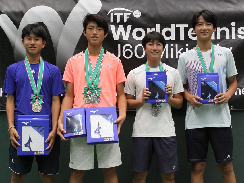 左から男子ダブルス優勝の川口孝大(はちおうじ庭球塾)、渡邉栞太(Tension)、準優勝の中富奏太(星田テニスクラブ)、大垣心太郎(INOUE TA)(写真提供◎一般社団法人兵庫県テニス協会)