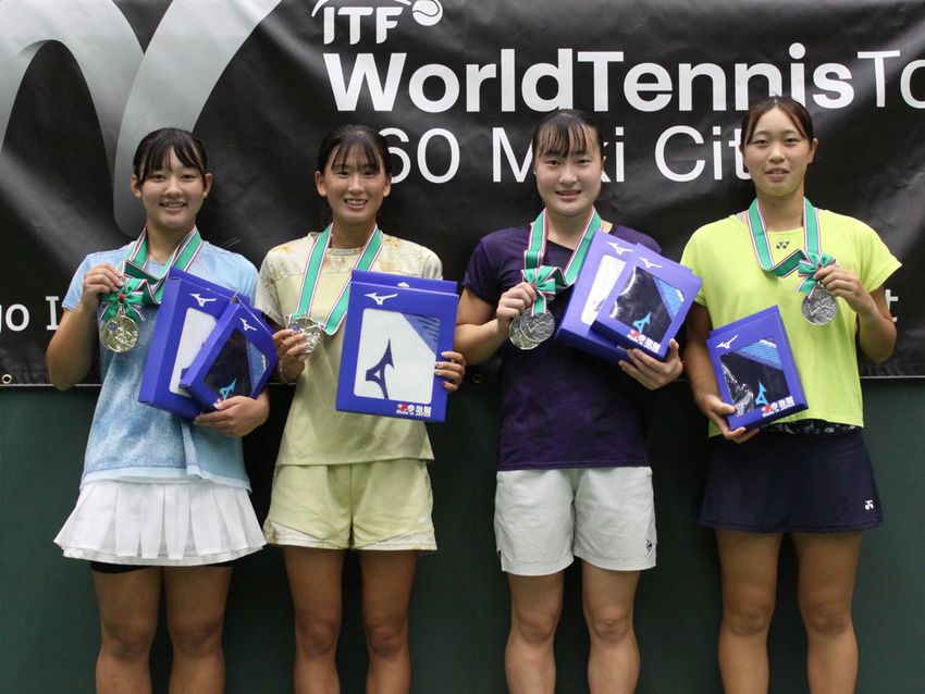 女子ダブルス優勝の鈴木美波(Wishテニスクラブ)、西脇美結(TEAMSTUFF)、準優勝の駒田唯衣(ノア・テニスアカデミー神戸垂水)、吉田紗良(荏原SSC)(写真提供◎一般社団法人兵庫県テニス協会)