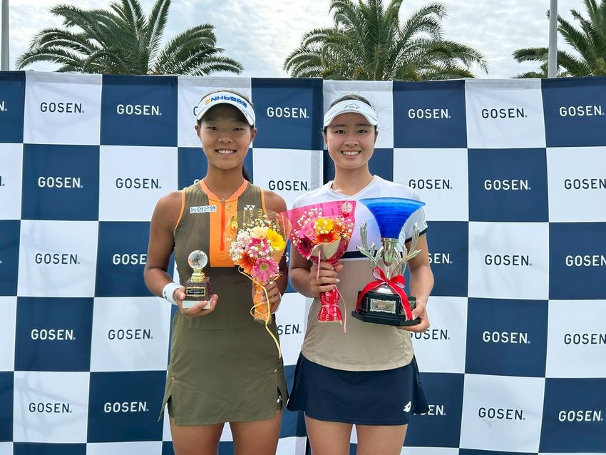 女子シングルスで2年ぶりの優勝を飾った齋藤咲良(富士薬品/右)と準優勝のバク・ダヨン(韓国)(写真提供◎牧之原国際女子オープンテニス実行委員会)