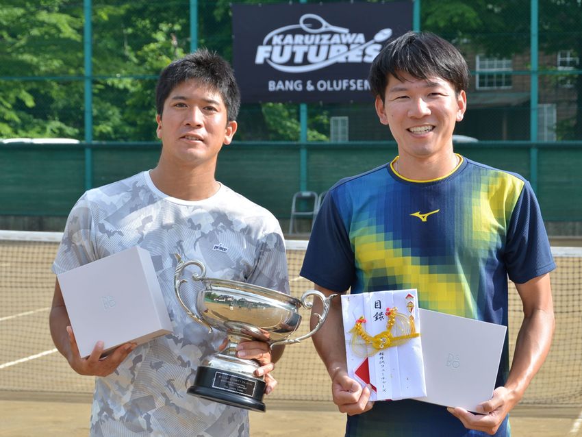 男子ダブルスで優勝を飾った河野優平(伊予銀行/右)と田中佑(筑波大学)(写真提供◎一般社団法人軽井沢テニス協会)
