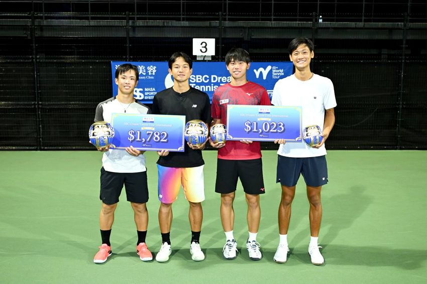 左から男子ダブルス優勝の齋藤惠佑(富士住建)、山中太陽(EMシステムズ)、準優勝の大岐優斗(いちご)、ビツウンテアン零朗(TPPトレーニングスタジオ)(©SBC Dream Tennis Tour 事務局/長浜功明)