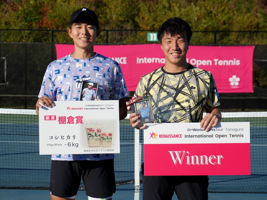 男子シングルスで優勝を飾った白石光(SBC メディカルグループ/右)と準優勝の楠原悠介(伊予銀行)(©ルネサンス国際オープンテニス)