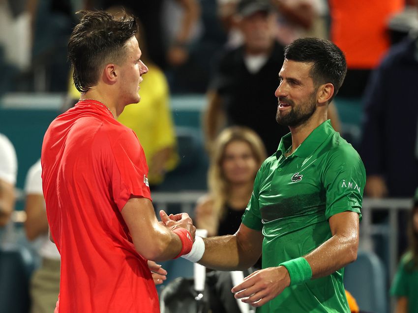 試合後に握手を交わすヤクブ・メンシク(チェコ/左)とノバク・ジョコビッチ(セルビア)(Getty Images)