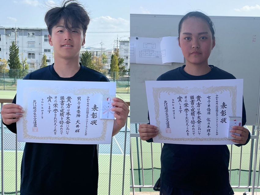 シングルスで優勝を飾った犬井輝(新潟医療福祉大学1年/左)と佐々木理子(新潟医療福祉大学1年)(写真提供◎北信越学生テニス連盟)