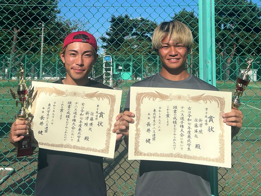 男子ダブルス優勝の佐藤隆矢(左)/新澤陸(東北学院大学4年/2年)(写真提供◎東北学生テニス連盟)