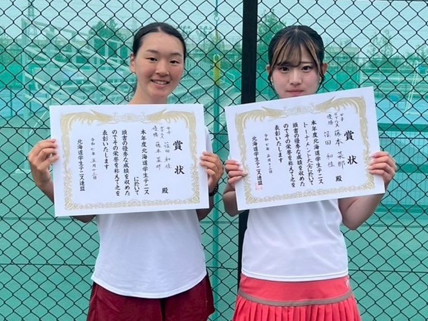 女子ダブルス優勝の篠田和佳(左)/藤本菜那(北海道教育大学岩見沢校1年/1年)(写真提供◎北海道学生テニス連盟)