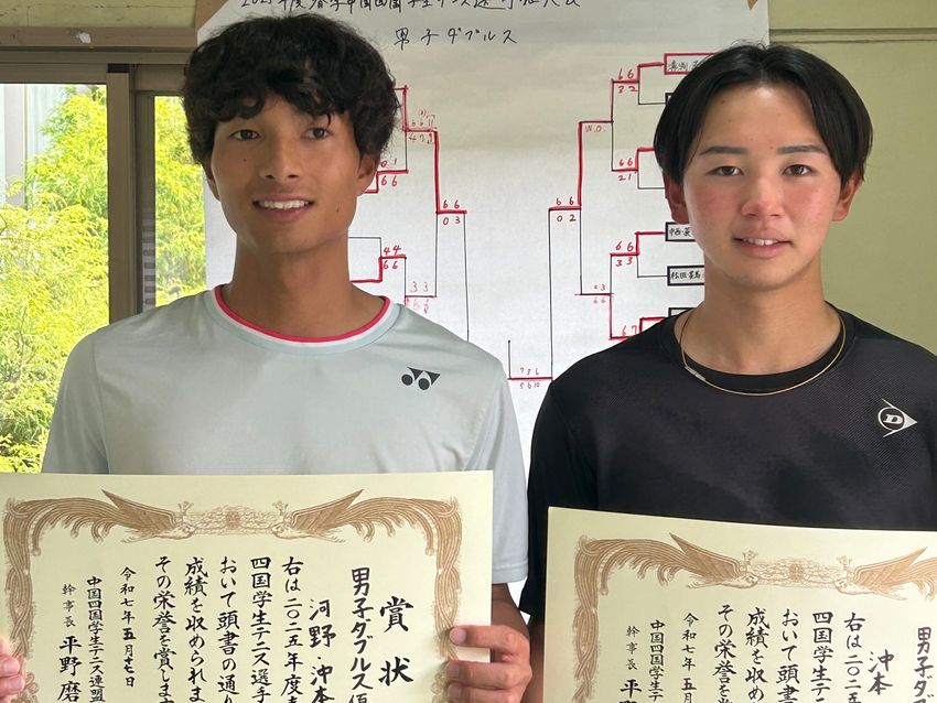 男子ダブルス優勝の沖本将生(右)/河野優(松山大学4年/3年)(写真提供◎中国四国学生テニス連盟)