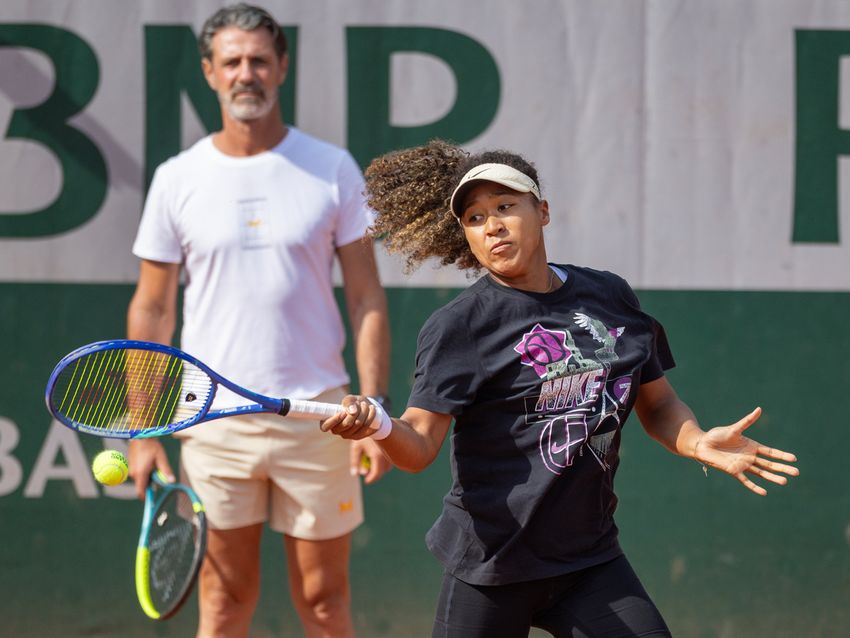 会場で練習中の大坂なおみ(フリー)、後ろはコーチのパトリック・ムラトグルー氏(Getty Images)
