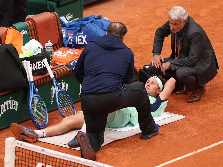 第3セット終了後にメディカルタイムアウトを取って治療を受けるキャスパー・ルード(ノルウェー)(Getty Images)