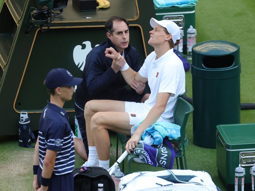 メディカルタイムアウトを取って負傷した右肘のチェックを受けるヤニク・シナー(イタリア)(Getty Images)
