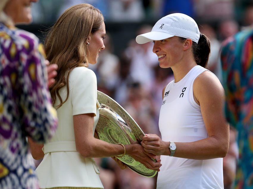女子シングルス表彰式でキャサリン皇太子妃(左)から優勝トロフィー(ローズウォーター・ディッシュ)を受け取るイガ・シフィオンテク(ポーランド)(Getty Images)