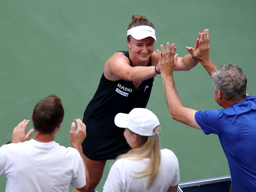 劇的な逆転劇で8強入りを決めてチームと喜びを分かち合うバーボラ・クレイチコバ(チェコ)(Getty Images)