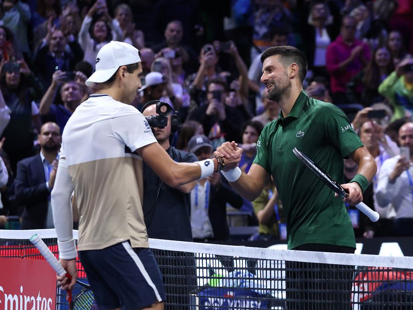 試合後に握手を交わすノバク・ジョコビッチ(セルビア/右)とアレハンドロ・タビロ(チリ)(Getty Images)